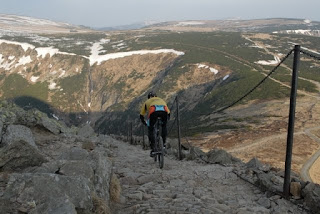 Už dlouho mě lákalo zkusit Sněžku vyjet a sjet. Výjezd po té staré kostkaté silnici (Polská strana) není žadný problém (až na to že nás v poslední zatáčce pod vrcholem málem srazila Polka v Land Roveru!?), sjezd (na XC biku) podél řetězů (opět severní úbočí) je vcelku na hraně. Naročná místa jsou uplný začátek (výsoký schod hned pod Polskou boudou a vcelku prudké klesání) a všechny zatáčky – většina z nich je poměrně ostrá a navíc v nich obvykle nechybí schod(y). V posledním rovném úseku (opojen tím, že se mi povedlo všechny zatáčky „proskákat“) jsem v té euforii výrazně polevil s koncentrací, což se mi ihned vymstilo letem přes řidítka. Naštěstí nic se mnou ani s kolem, jen jsem si trochu narazil koleno. Lukášovi byla z toho focení nahoře zima, sjel to rychle a čekal dole, Vilda jel kousek za mnou a také se tam někde smotal a lehce si ostrouhal koleno.