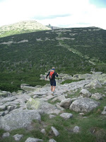 Z Pomezek jsme (dalších 25km) pokračovali po červené směr Jelenka, za kterou jsme na schodech vedoucích na Svorovou horu (1410m) poprvé vyrazně zpomalili do svižné chůze a udělali pár fotek. Na hřebenu jsme se opět rozeběhli a poté se vyškrábali na Sněžku. V nohách jsme podle Polaru měli 22km a nastoupných 1500m. Na vrcholu na nás čekali roztleskávačky od Vildy (Pája a Péťa), kterým jsme pomohli od čokolády a vody. Z 1.5 litru ionťáku na zádech mi jestě asi 3 deci zbývaly, takže jsem v té rychlosti ani vodu nedoplňoval (Vilda myslím také ne). Vyrazili jsme dál s tím, že je to na Špindlerovku kousek. S tím kouskem jsem se ale trochu seknul a navíc jsem úplně nepochopitelně odbočil lehce doprava hned za boudou dole pod Sněžkou. To že neběžíme po červené po hraně nad polským plesem ale klesáme do Polska jsem přes Vildovo pochybování o směru přiznal až asi po kilometru. Po návratu zpět jsme začali ukrajovat z nekonečných 11km (včetně těch 2 navíc) ke Špindlerovce. Slunce vystoupalo vysoko a přes příjemný vítr začalo být dost teplo. Zbytek vody jsem vypil a dopadla na mě krize, vlastně jediná ted den. Věděl jsem, že si jídlo ani gel s tou vyprahlostí a bez vody moc neužiju, a tak jsem se snažil moc na tu krizi nemyslet a běžet dál. Trochu jsem asi přestal myslet i na to že musím zdvihat nohy a párkrát škobrtnul a nakonec i si dokonce odřel koleno. Než jsme doběhli na Špindlerovku tak jsem tou krví trochu děsil protijdoucí turisty. Tam jsem si koleno umyl a po Cole jsme pokračovali směrem Dívčí kameny a Mužské kamemy. Při seběhu jsme posvačili a sbírali síly před posledním stoupíním na Vysoké Kolo (1506m), kde jsme na 4,5km nasbírali 400 výškových metrů. V závěru stoupání dostihla krize Vildu, který s ní pak víceméně objoval do konce. Kousek za Violíkem (1472m) jsem minuli metu 42km a pogratulovali si navzájem k tomu, že od teď je to ultramaraton.